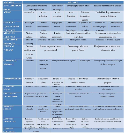 Dicha metodología incluyó la definición y el análisis de las dimensiones influye en la competitividad turística de un destino, con el fin de generar un retrato de la realidad local y posibilitar, con su análisis e interpretación, la definición de acciones y de políticas públicas volcadas a la estructuración y el desarrollo turístico del municipio (Barbosa, 2013).