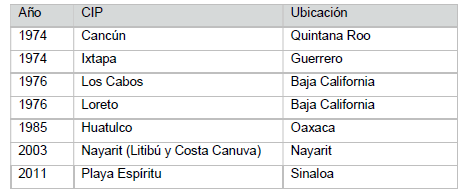 Así, en 1974 inicia la construcción de los primeros dos CIP, Cancún e Ixtapa Zihuatanejo y, sólo dos años después, Loreto y Los Cabos. En la década de 1980 se construyó sólo uno, Huatulco; y fue en 2003 que se retomó el programa iniciando la primera etapa del CIP Nayarit en el municipio de Bahía de Banderas, que continúa inconcluso (Tabla 1).