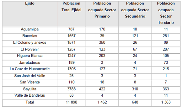 La prevalencia de la población en los ejidos y comunidades agrarias puede ser un indicador de las condiciones económicas que se viven en éstos. Para 2007 en Nayarit se estimó un porcentaje de 44.1% de ejidos con jóvenes que se integran a alguna actividad productiva (INEGI, 2007). De acuerdo al primer censo agropecuario de Bahía de Banderas como municipio independiente, en 1991 la orientación hacia la terciarización de la economía se visualiza en su población ocupada en este sector, principalmente en ejidos costeros como Sayulita y Bucerías. Para el 2007 se estimó que, del total de personas ocupadas en el sector primario, sólo el 30% son familiares y el 70% son contratados, de los cuales en casi el 80% su período de contratación es de 6 meses o menos (Tabla 2).