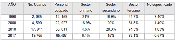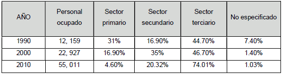 Para el año 2000 es notorio el incremento de la población ocupada en el sector secundario, en la que destaca la construcción como actividad preponderante y piedra angular para el turismo. El incremento en el número de unidades de cuartos repercute en la mano de obra requerida para su construcción y posterior operatividad, para el año 2010 el sector terciario crece casi 30 puntos porcentuales y disminuye drásticamente el primario, alcanzando apenas 2,530 personas ocupadas en la agricultura, ganadería o pesca (Tabla 6).