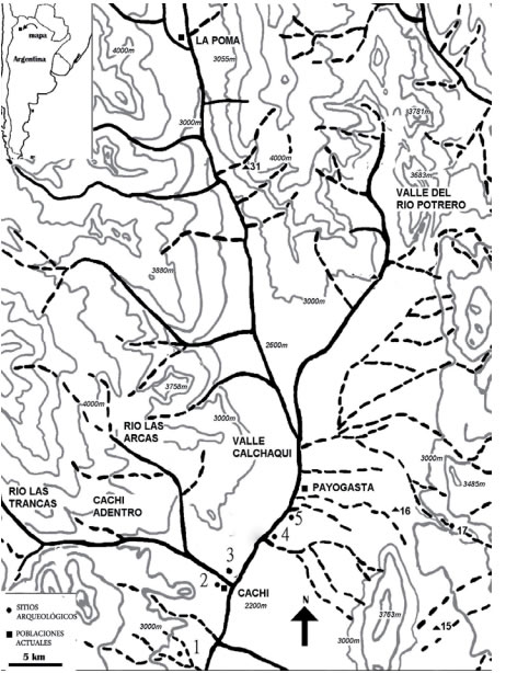 El Valle Calchaquí forma parte de la región Valliserrana, la cual, junto con las regiones montañosas de las provincias de Jujuy, Salta, Tucumán, La Rioja, Catamarca y norte de San Juan constituyen lo que se denomina Noroeste Argentino (Difrieri, 1959). Por su historia sociocultural forma parte del área Andina Meridional (González, 1966). Se trata de una formación tectónica de aproximadamente 200 km de longitud, emplazada entre el macizo puneño y parte de la cordillera oriental; tiene una orientación norte a sur e incluye parte de la provincia de Salta, Argentina (Figura 1). Tanto este valle como sus quebradas laterales estuvieron habitados desde el periodo Arcaico (6000-400 aC), con las primeras ocupaciones en el comienzo del período establecidas a partir de los hallazgos en sitios como Punta del Diablo y Agua de los Loros (Tarragó, 1974; Gheggi 2011).