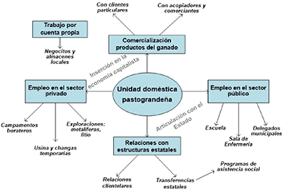 Al referirnos al ámbito de la economía doméstica podemos plantear el análisis en términos de las estrategias económicas que combinan en diversas formas el pastoreo con la inserción en la minería y la articulación con el Estado. Entre las actividades de diversificación económica que puede combinar un mismo grupo podemos reconocer: a) el empleo público, b) la percepción de diversas transferencias estatales, c) el empleo en el sector privado, d) la comercialización de productos ganaderos, y e) las actividades de comercio local.