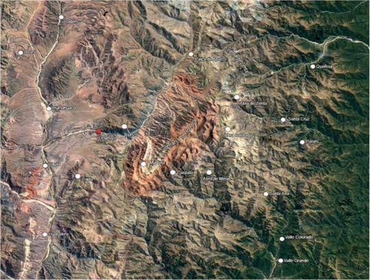 El área geográfica en la que se realizó el estudio está ubicada en el sector septentrional de la Quebrada de Humahuaca. Tomando la comunidad de Ocumazo como punto de referencia, dicha área quedó delimitada con base en la red de caminos que son o que han sido utilizados por los entrevistados para llegar a localidades vecinas en el desarrollo de sus actividades cotidianas (ver mapa).
