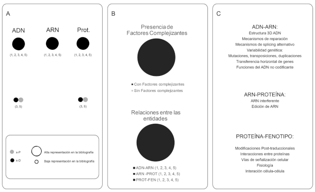 Junto con la conceptualización de las entidades involucradas —genes, ARN, proteínas—, aparece la pregunta por el tipo de relación que se presenta entre ellas. Entre los diferentes tipos de relaciones, hay una distinción que resulta fundamental a nuestros fines: indagar si estamos (o no) frente a escenarios lineales y deterministas. Se buscarán entonces elementos que complejicen los vínculos entre las entidades, a los que denominaremos "factores complejizantes". Estos factores son procesos, mecanismos, características biológicas que impiden considerar una relación 1:1 entre los genes, el ARN, las proteínas y el fenotipo. Vale la pena aquí recordar que, hasta los años setenta, se ha considerado que el vínculo era unívoco, siendo la información tal que, del ADN, se obtengan linealmente las moléculas de ARN y otro tanto para las proteínas (Portin, 1993; Neuman-Held, 1999). En gran medida, tal conceptualización proviene de la formulación del "dogma central de la biología molecular" (Crick, 1958), en el cual se establece la dirección del flujo de información genética del ADN a las proteínas, mediado por la molécula del ARN.