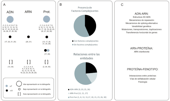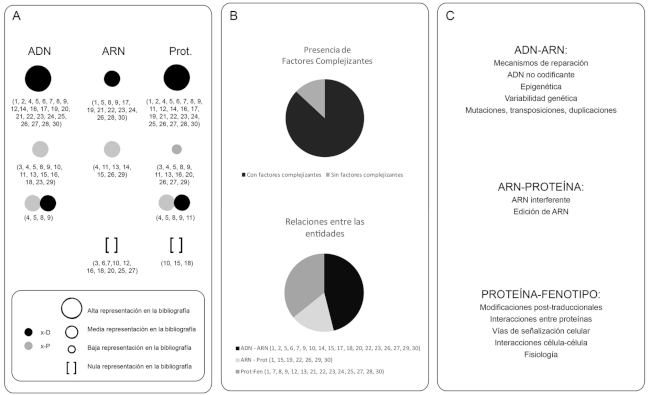 Resultados de las conceptualizaciones halladas en los artículos publicados en revistas especializadas de genética molecular. En A se muestra la presentación en bibliografía de las nociones. En B se presenta el tipo de relaciones entre entidades. En C se detallan los factores reconocidos en cada caso.