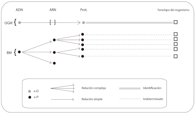 Comparación entre la visión de la genética molecular y la de la biología molecular disciplinar. En el caso de los OGMs, se presentan relaciones simples (lineales), en el que un gen codifica para una proteína y esta se identifica con el fenotipo. Por el contrario, para la biología molecular, los vínculos son complejos e indeterminados.