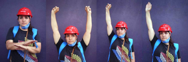 Precisamente, la imagen del puño en alto utilizada por los brigadistas profesionales y voluntarios durante las labores de ubicación, identificación y rescate de las víctimas atrapadas bajo los escombros de los edificios derrumbados para solicitar silencio de los asistentes les ha acompañado durante las movilizaciones y eventos conmemorativos, pero reformulada con el lenguaje de la lucha popular según refiere Iván Martínez (Imagen 3).