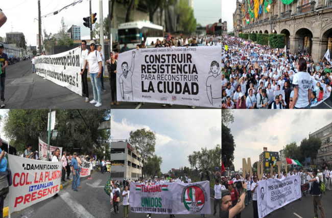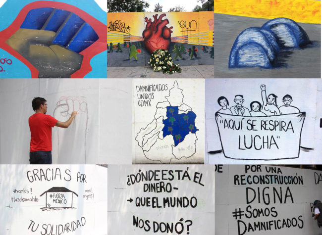 Con frases como: “¿Y dónde está el dinero que el mundo nos donó? Con eso nos alcanza para la reconstrucción”, “Vivienda sí, créditos no”, “La tierra tembló y a Mancera derrumbó”, “Construir resistencia para reconstruir la ciudad”, “Por una reconstrucción digna”, “La dignidad no se derrumba”, “Los damnificados no serán olvidados”, “No somos desechos del terremoto, somos ciudadanos con derechos”, “Los derechos no se negocian, se ejercen”, “Por los caídos: presente, presente, presente”, este grupo de damnificados organizados comunican a los transeúntes que observan su creación gráfica o escuchan sus arengas durante el transcurso de las marchas, el sentido de su movilización: la reconstrucción digna, justa y segura.