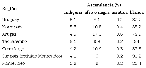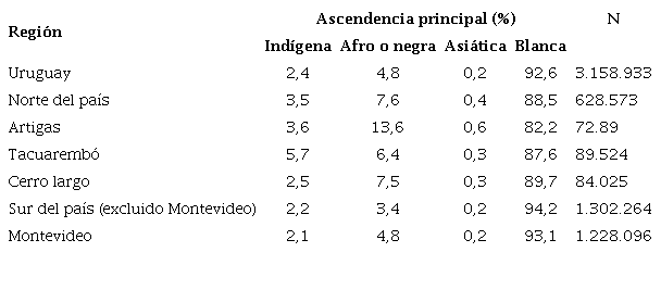 También para la ascendencia general, los departamentos en los cuales se declaró mayor porcentaje de ascendencia indígena fueron Tacuarembó (8,1%) y Salto (6,4%), y menor en Colonia (2,6%), Lavalleja (3%) y Florida (3,1%). Debe notarse que, si bien los aportes indígenas varían poco, tanto para ascendencia principal (1,1 a 5,7%) como para ascendencia general (2,6 a 8,1%), los aportes africanos tienen mayor variación: para ascendencia principal, oscilan entre el 1,5 y el 13,5%, y para ascendencia general, entre el 3 y el 17,3%. El aporte asiático nunca supera el 1% (INE, 2011).