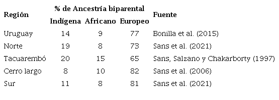 En la tabla 3 se resumen los datos sobre herencia biparental (autosómica) a partir de distintos marcadores genéticos (polimorfismos sanguíneos o marcadores individuales de ancestría -AIM, por sus siglas en inglés-). En el caso de Montevideo, se ponderó por lugar de atención de salud (público o privado/mutual), puesto que se encontraron diferencias significativas en los aportes (Sans et al., 2021).