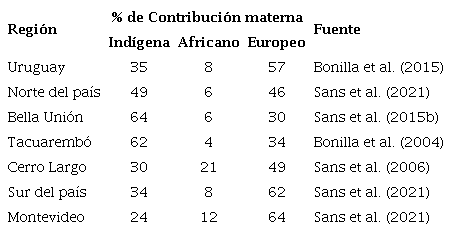 En la tabla 4 se muestran los aportes por línea materna estimados por ADN mitocondrial (ADNmt). También en esta tabla se ponderaron los datos de Montevideo debido a las diferencias por lugar de atención de salud (Sans et al., 2021).