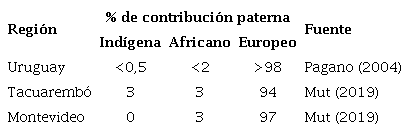De los datos genéticos, así como de información histórica, se desprende que fueron fundamentalmente mujeres indígenas quienes se integraron a la sociedad nacional. En el departamento de Tacuarembó, la ancestría materna por ADNmt es del 62%, mientras que la paterna por cromosoma Y es del 3%. En Montevideo, esos datos varían de 24% a 0% respectivamente (tablas 4 y 5). En todos los países mencionados y las diferentes subregiones se da la misma situación, sea comparando ADN mitocondrial con herencia autosómica, o cualquiera de estos con estudios del cromosoma Y. Las uniones direccionales hombre europeo o eurodescendiente con mujer indígena o descendiente se observan en toda América Latina, sin excepción (Sans, 2000). A modo de ejemplo, para Buenos Aires, el aporte materno indígena en el área metropolitana fue del 44%, y el autosómico, en la misma región, del 15% (Avena et al., 2006).