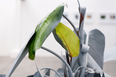 En un sentido diferente, guiado por una búsqueda ético-afectiva, se inscribe la obra Herencia,4 del artista brasileño Marlon de Azambuja (Figura 2), quien denuncia las operaciones culturales que masifican a los individuos. Según el artista, la incorporación no se da sin ciertas resistencias por preservar la autonomía individual. Herencia consiste en una instalación de plantas tropicales cuyas hojas han sido pintadas con pintura gris, lo que interfiere en sus procesos vitales. Con el tiempo, algunas plantas sucumben, mientras que otras logran generar nuevos brotes, lo que simboliza a los individuos resilientes que sobreviven a la masificación. Aunque la obra propone una reflexión sobre la resistencia, también reproduce una lógica de manipulación violenta, de acuerdo con la cual las plantas son instrumentalizadas para transmitir un mensaje.