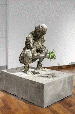 En esta clave también puede leerse la pieza Mundos sobre rastros, todos somos líquenes, de Romina Orazi, del año 2021, que abre a otras reflexiones. Es la escultura de una mujer en cuclillas sobre una base de cemento, recubierta por líquenes, y con un helecho en sus manos. La obra remite a la idea de ruina: no se trata solo del avance de la vegetación sobre una construcción humana, sino sobre un bloque de cemento -metáfora del dominio humano (urbano)- que, a su vez, no es un bloque cualquiera, sino uno que ensalza la figura humana (generalmente masculina) en un pedestal (Figura 11). Sin embargo, aquí la figura humana es la de una mujer en una posición que podría interpretarse tanto de parto como de jardinería. En ambos casos, remite a la idea de dar y/o cuidar vida.