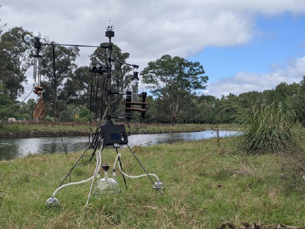 Hay presentes, empero, otras resonancias, que nos hacen intuir un leve desajuste de este paisaje sonoro. En un primer momento nos vemos en el territorio de la naturaleza. Pero al rato notamos otros sonidos: golpecitos titubeantes, tintineos ligeros, el tañido de lo que pareciera es un xilofón. Comenzamos a sospechar que el territorio de nuestras percepciones no se deja definir tan claramente: seguimos adentrándonos en la experiencia y descubrimos que, en una pequeña pantalla azul, se grafican valores de capacitancia, humedad, temperatura ambiente y de CO2. De pronto, saltan a la vista instrumentos de laboratorio, cables, tubos translúcidos, hélices de un anemómetro, pero también y en simultáneo, palillos, chas-chas,7 llamadores de viento, y una hoja verde que, agitada por el viento, pone en movimiento un mecanismo misterioso, que difícilmente podría ser comprendido del todo en un primer encuentro (Figura 3).