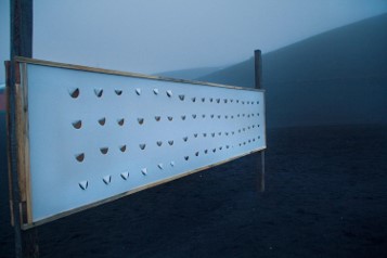 La obra fue realizada en la Base Decepción, que no era el destino original que motivaba el viaje, y la propuesta tampoco respondía a lo que inicialmente se pensaba realizar. La artista relata que un hecho fortuito provocó el desembarco en la Base Decepción, y que, a partir del encuentro con la materia del entorno, decidió dejarse afectar y abrir -literal y simbólicamente- sus lienzos, casi como un guiño a la decepción de la base. La obra es el registro de ese proceso, portadora de una “memoria de la materia” (Figuras 4-5). Propone un vínculo alternativo con el mundo, a la vez que señala que solo se pueden explorar otras lógicas relacionales si se habilita una “mayor vulnerabilidad en el gesto” (Simbiología. Prácticas artísticas en un planeta en emergencia - CCK, s. f.). Se trata de disponerse a percibir qué otras memorias e historias portan las materias con las que cohabitamos.