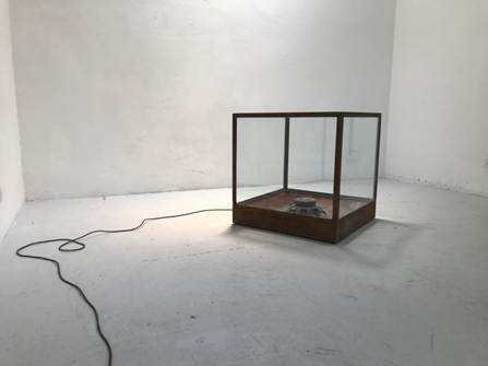 En otra línea, la obra A tree ashes, del artista chaqueño Juan Sorrentino, también propone relaciones de mutua afección entre distintas materialidades. La pieza consiste en un cubo de vidrio de 84 centímetros de alto, de ancho y de profundidad. En su base hay un parlante que, cada cuatro minutos, emite sonido a 47Hz, un tono grave, cerca del límite de las frecuencias perceptibles por el oído humano (Figura 6). Sobre el parlante hay una capa de cenizas de árbol ‒que dan título a la obra‒ y cada vez que el parlante suena, la vibración hace volar las cenizas dentro del cubo.