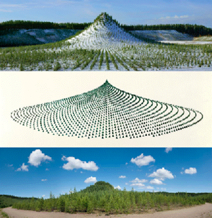 Otra obra, en este caso de la artista húngara Agnes Denes, Tree Mountain - A Living Time Capsule-11,000 Trees, 11,000 People, 400 Years, evidencia que, al igual que omitimos la agencialidad de la materia a microescala, también tendemos a omitir las agencias que operan a escala de lo macro. La artista creó, entre 1992 y 1996, un proyecto en el que 11.000 personas plantaron 11.000 árboles en una montaña artificial en Finlandia, siguiendo un patrón matemático, con el objetivo de que estos pinos sobrevivan 400 años (Figura 7).