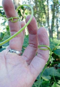 Las plantas son seres inteligentes, sensibles y sociales (Mancuso y Viola, 2015; Coccia, 2017). La artista colombiana Pilar Santamaría Motta, en su performance VerdeMente,15 construye diálogos entre “pueblos humanos” y “pueblos vegetales” mediante su canto y desde la caricia. En esta gestualidad, la artista es acariciada a su vez por el zarcillo de una planta de calabaza (Cucurbita spp.) (Figura 10). Si nos detenemos en el registro audiovisual, podemos notar que también se manifiesta una temporalidad divergente. El tiempo de lo vegetal se encuentra fuera de la escala humana: el canto se prolonga lo suficiente como para que el zarcillo rodee por completo los dedos. ¿Alguna vez nos hemos preguntado cuánto tiempo lleva que un zarcillo de zapallo envuelva una vara? ¿Nos tomamos el tiempo necesario para observar una nube atravesando el cielo hasta que desaparezca en el horizonte?