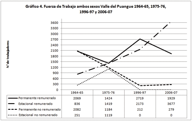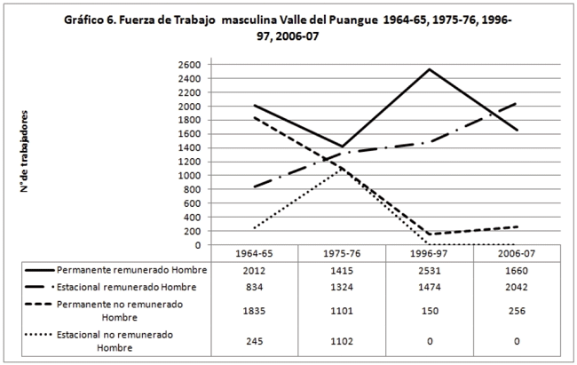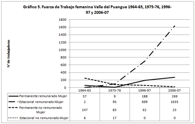 En lo que respecta al empleo permanente, predominan los hombres. De igual modo, destaca que desde el período 1964-65 hay presencia de trabajadores estacionales varones, los que aumentan con las plantaciones frutícolas, pero en menor magnitud que las mujeres.