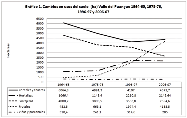 El gráfico siguiente es contundente: si bien desde la década de 1990 se acrecienta la plantación de frutales, los cultivos "tradicionales" como cereales, hortalizas y forrajeras, tienen un rol relevante.
