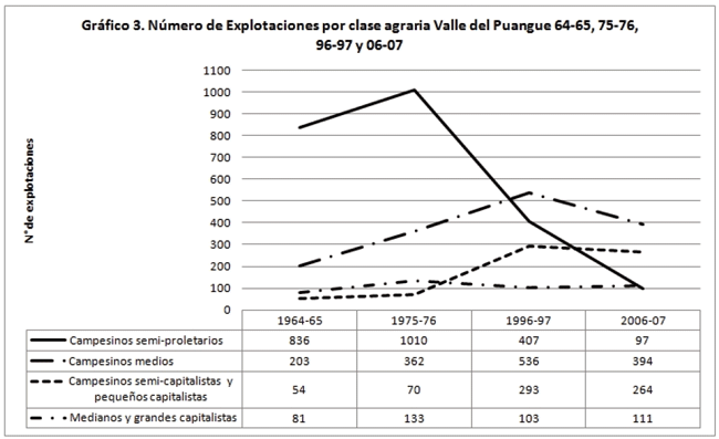 Un fenómeno estructural territorial, que no es generalizable a la escala anterior, corresponde a la conformación de un sistema de clases agrarias de carácter híbrido y de procesos contrapuestos. Nos referimos a una tendencia de proletarización del agro territorial a la par de una presencia sustancial de campesinado medio y semicapitalista que simultáneamente compra fuerza de trabajo externa a la familia y vende de la propia, semiproletarizándose mientras se semicapitaliza8.