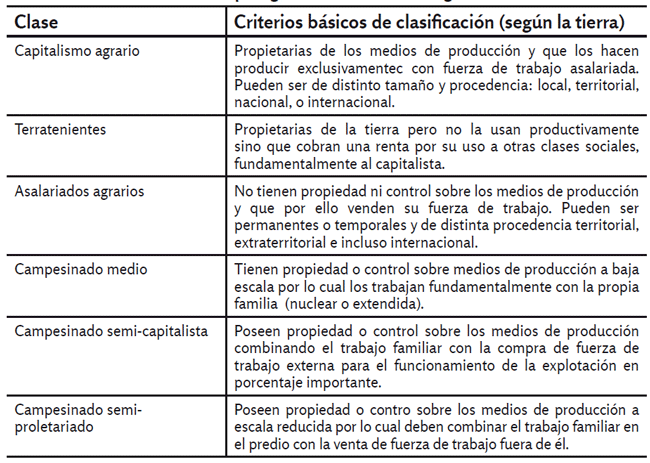 De este modo, serán clases agrarias los distintos grupos en este sector económico según los criterios indicados, fundamentalmente considerando los diversos modos (dentro y fuera de la regulación legal) de control de los principales medios de producción: tierra, agua, maquinarias y herramientas, y las luchas sociales en torno a ellos. Pero no sólo ello es relevante en los estudios concretos, sino que también lo son las lógicas y prácticas de distribución, circulación y consumo de los propios productos generados, y de los otros tantos bienes y servicios a los que se accede a través del mercado u otras formas de intercambio.5