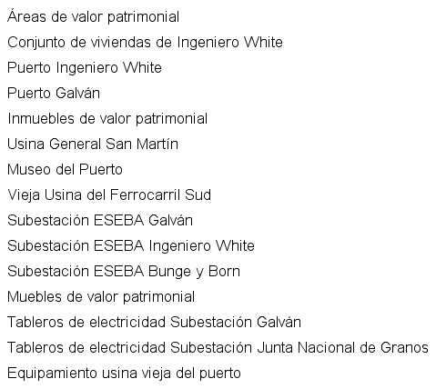 elaboración propia con base en http://www.openstreet-map.org (2017).De acuerdo con el objetivo de este trabajo, indagar acerca de los conflictos que se producen en torno al patrimonio cultural local implica determinar aquellos actores clave que incentivaron el conjunto de actividades encaminadas a la selección y sacralización de los bienes culturales que pasaron a formar parte del ideal de cultura del poblado. En Ingeniero White se pueden identificar dos grandes creadores del patrimonio cultural: en primer lugar, el Estado, representado por la Municipalidad de Bahía Blanca, que, a partir de determinados instrumentos de gestión, ha legitimado ciertos bienes en detrimento de otros; y en segundo lugar, algunas de las empresas que estructuran el puerto local y aquellos organismos específicos vinculados a este. Ambos ámbitos de poder comparten espacios comunes de decisión, como es el caso del Consorcio de Gestión del Puerto de Bahía Blanca, que constituye un ente público no estatal, integrado por representantes de los sectores público-privados. En 1992, mediante la Ley Nº 24.093 se autorizó la transferencia de los puertos de propiedad del Estado nacional a las provincias. Un año después, se creó esta organización, y así, el puerto de Ingeniero White se configuró como el primero de carácter autónomo de la Argentina (Consorcio de Gestión del Puerto de Bahía Blanca, 2017). Este paso de manos públicas a privadas condujo a una segregación espacial entre la propia localidad y el área costera, y despojó a los pobladores de un sector que antiguamente funcionaba como lugar de recreo y esparcimiento. En este contexto, como primera afirmación se puede decir que tanto el poder político como el económico se trasforman en los “constructores” del patrimonio a escala local. En este caso, la población adquiere un rol más pasivo, y es la legitimadora de aquello patrimonializado, a partir del uso social de algunos de estos espacios con determinadas funcionalidades, principalmente de aquellas de carácter recreativo o cultural.