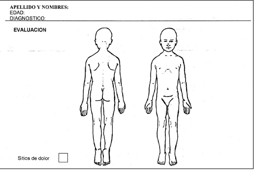 Las médicas no solo inspeccionan sino que registran el dolor. Poseen formularios donde consignan la localización e intensidad de los dolores. En un gráfico como el que muestra la figura 1, colorean los "sitios del dolor".