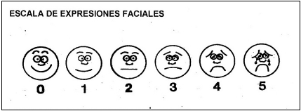 Hoja de historia clínica. Escala de dolor por expresiones faciales. Escaneada del original.