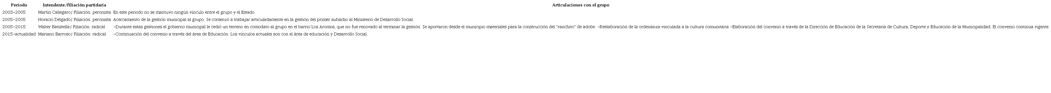 El vínculo entre los grupos de teatro comunitario y el Estado ha sido abordado como una preocupación por varias autoras y autores (Fernández, 2018; Sánchez Salinas y Mercado, 2018; Sánchez Salinas, 2020). Uno de los elementos que encontramos en todos estos trabajos es que, si bien ese vínculo siempre ha sido conflictivo y tensionado, el Estado es un actor presente en las trayectorias de la mayoría de los grupos de la Red Nacional de Teatro Comunitario, así como también en las historias personales y laborales de muchos/as de sus integrantes. En el caso de Cruzavías, ese vínculo fue cambiando de acuerdo con las gestiones de turno y los contextos, pero siempre estuvo presente, ya sea a partir de las ayudas económicas como desde otro tipo de articulaciones. Presentamos una periodización en el siguiente cuadro:
