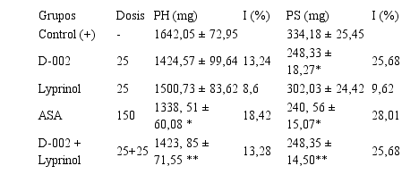 La Tabla 1 muestra los resultados de la respuesta del efecto de las monoterapias D002 y Lyprinol, ambos aplicado s a la dosis de 25 mg/kg; el ASA (150 mg/kg) y la terapia combinada de D-002 más Lyprinol, a iguales dosis que las monoterapias, sobre los parámetros de peso húmedo (PH) y peso seco (PS) del granuloma inducido por algodón en ratas.