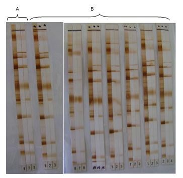 Se evaluaron 14 lotes de producción industrial del R1 del sistema DAVIH-BLOT con 24, 30, 36 y 96 meses de producidas, así como 9 lotes de R1 del sistema DAVIH-BLOT-HTLV-I con 24, 48 y 96 meses de producidos. Esta diferencia en los periodos de evaluación, se corresponde simplemente con la disponibilidad de estuches en anaqueles. Ambos componentes, estaban almacenados entre 2 y 8 ºC en su envase definitivo. Se empleó un R1 control para cada uno que consistió en tiras de nitrocelulosa recubiertas con antígeno de VIH-1 y HTLV-I respectivamente con 12 meses de producidas. Para las R1 de VIH-1, se ensayaron cinco tiras de cada lote con un panel que contenía un suero control negativo, un suero control positivo y tres sueros positivos débiles por ELISA o Western blot (Fig. 1).