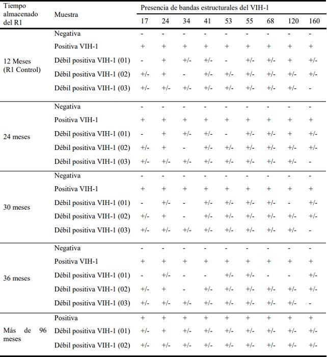 En la tabla 1 se exponen los resultados de las evaluaciones de los lotes de R1 del sistema DAVIH-BLOT en los periodos de tiempo de almacenamiento evaluados con el panel de muestras de sueros de referencia. Los sueros controles positivos en las tiras de R1 mantuvieron el patrón de bandas con similar intensidad a las R1 control en todos los periodos de tiempo evaluados. Las muestras de sueros débiles positivos de las tiras de R1 evaluadas mostraron un patrón de bandas de menor intensidad, señaladas con el signo (+/-) similares a las R1 control. En todos los casos, las muestras débiles positivas revelaron un patrón de reactividad positivo. Este perfil de reactividad es específico en cada muestra, de acuerdo a la dinámica de respuesta de anticuerpos del paciente en el momento en que se toma. El patrón de reactividad; aunque siempre resultó débil para algunas proteínas estructurales, según se muestra en la tabla, no cambió con el tiempo.