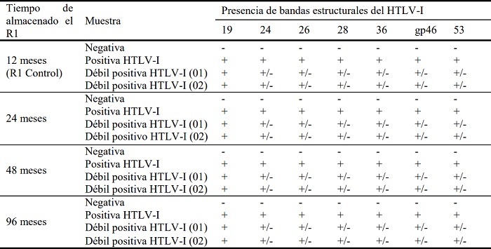 En la tabla 2 se exponen los resultados de las evaluaciones de las R1 del sistema DAVIH-BLOT-HTLV-I. Los patrones de bandas de las tiras de R1 en los diferentes periodos de tiempo fueron similares a las R1 empleadas como control al comparar, tanto los sueros positivos entre sí como los sueros positivos débiles. Estos últimos mantuvieron su condición de positivos en todos los periodos de almacenamiento analizados. Los patrones de reactividad débil no variaron con el tiempo.