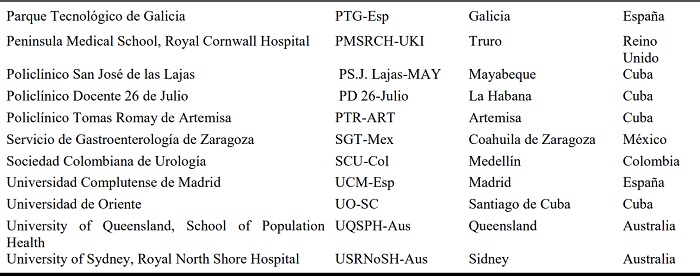 El tipo de institución predominante en los países colaboradores fue la institución hospitalaria (6), seguido por las universidades (5), los centros de investigación (3) y 2 instituciones de atención primaria de salud.