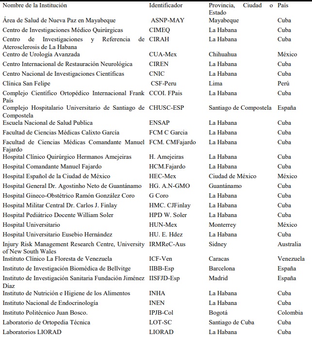 Las instituciones hospitalarias cubanas (8 entidades) predominaron entre los tipos de instituciones más productivos. Además, intervinieron en la producción científica autores de seis centros de investigación (dos de ellos con servicios de salud incluidos), cuatro áreas de atención primaria de salud, cuatro universidades y dos laboratorios. La colaboración de los hospitales con centros de investigación e instituciones de institución primaria fue predominante.