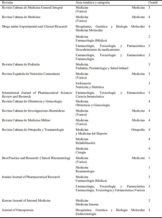 La producción científica nacional sobre Osteoporosis fue publicada en 30 revistas de 13 países (Tabla 2). Estas 30 revistas exhibieron un SJR promedio de 0.271, y la mayoría se encuentran ubicadas actualmente en el tercer y cuarto cuartil de sus correspondientes categorías temáticas (ver Anexo 1), lo que indica que no son las de mayor visibilidad internacional para la base. Después de Cuba; España y Suiza son los países donde más publican los investigadores cubanos sobre el tema. La mayor cantidad de artículos está contenida en la Revista Cubana de Medicina General Integral y en la Revista Cubana de Medicina.