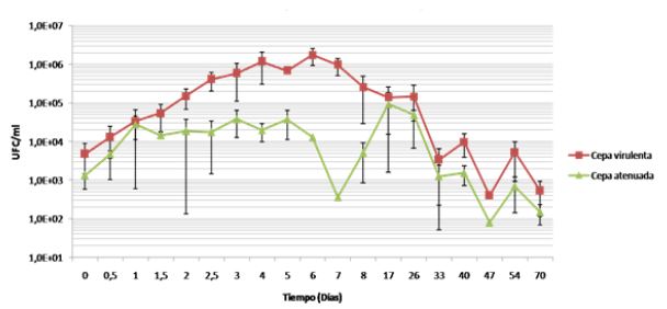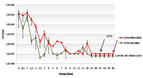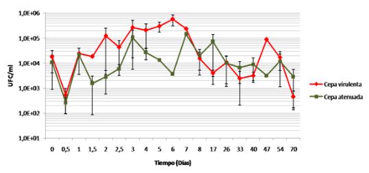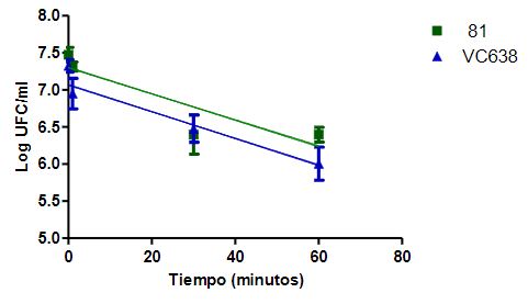 Al finalizar el experimento fue evidente para ambas cepas la caída de la cantidad de UFC. No obstante, los conteos para la cepa VC638 fueron inferiores solo en un orden logarítmico en comparación con las UFC de 81. Para comparar el desempeño de ambas cepas se ploteó el Log UFC/ml contra el tiempo y se obtuvo, con una probabilidad razonable, una recta cuya pendiente indica la velocidad de inactivación. El análisis estadístico comparativo de las pendientes de las rectas obtenidas indica que no existen diferencias significativas entre estas (Prueba F, F=2,277; Dfn =1; Dfd=35; p = 0,1403). Por cuanto, VC638 es semejante a su parental directo, la cepa 81. Lo que sugiere que, en el proceso de construcción de la cepa vacunal, esta no obtuvo determinantes nuevos que favorecieran su resistencia a agentes estresantes como la alta salinidad.