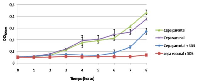 La susceptibilidad al detergente dodecil sulfato de sodio (SDS) se evaluó usando concentraciones crecientes del agente estresante desde 0,05% hasta 0,5%. Se observó el comportamiento de las cepas VC638 y C7258 en presencia y en ausencia del detergente SDS en medio TSB suplementado con glucosa 0,4%. Se detectó una completa inhibición del crecimiento en la cepa vacunal con 0,05% de SDS (mínima concentración ensayada), mientras que C7258 a esa concentración continúa creciendo (Fig. 3). La Concentración Mínima Inhibitoria del SDS en la cepa VC638 in vitro es dos veces menor que la de su parental toxigénico C7258, por lo que en presencia de este compuesto su sobrevivencia en el ambiente pudiera estar afectada.