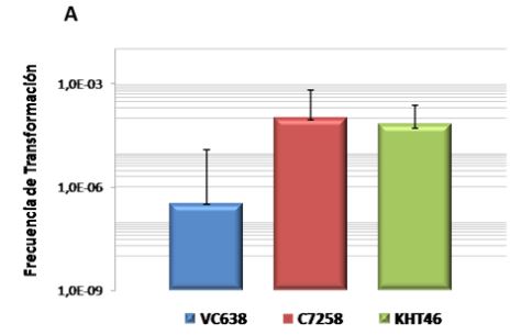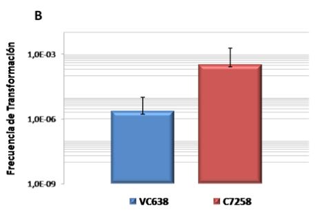 En una primera instancia, se analizó la capacidad de transformación natural de la cepa VC638 en comparación con su parental C7258 empleando el exoesqueleto de langosta como fuente de quitina, de acuerdo con Meibom y cols, 2005 demostraron que V. cholerae en presencia de quitina se hace competente y es capaz de adquirir ADN soluble presente en el medio e incorporar ese nuevo ADN a su cromosoma, mediante mecanismos de recombinación homóloga. Teniendo en cuenta que la cepa VC638 no produce la fimbria hemaglutinina sensible a manosa (MSHA), (25) se decidió evaluar, además, su desempeño en comparación con la cepa KHT46, mutante del gen mshA, que codifica la subunidad principal de dicha pilina. Los resultados de tres experimentos independientes demostraron que la frecuencia de transformación de las cepas C7258 y KHT46 es de 102 a 103 veces mayor que la de la cepa VC638 (Fig. 4A).