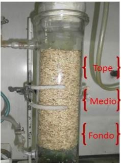 El aislamiento se realizó a partir de partículas de fibra de kenaf utilizada como empaque de un biofiltro escurrido, luego del tratamiento del gas natural.9,10 En la misma se encuentra adherida la microbiota de los lodos activos utilizados en este tratamiento. Las muestras se tomaron del tope, medio y fondo del equipo (Fig. 1); a fin de recuperar la mayor variabilidad de microorganismos sulfooxidantes que se encuentran inmovilizados a lo largo de la columna de biofiltración.