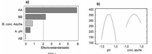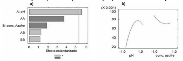 El análisis para cada uno de los efectos estimados y las interacciones demostró que en orden decreciente la variable de mayor significancia estadística fue el pH (P< 0,05) (Fig. 2a). Así mismo la variabilidad de DO en piezas separadas para cada uno de los efectos (Fig. 2b); donde se demuestra que la mayor densidad óptica se obtiene a pH 4 y concentración de azufre de 5 g.L-1.