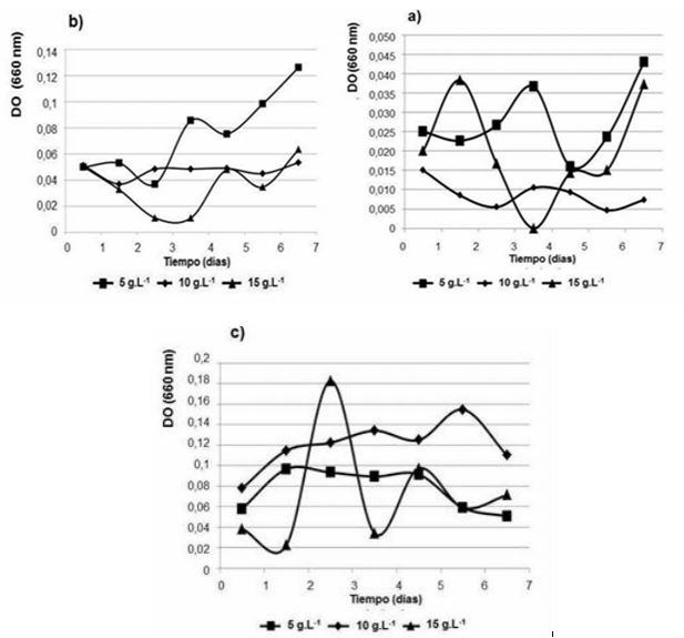 El crecimiento general de la población del consorcio se mantiene durante todo el período en las tres condiciones de pH, aunque la absorbancia disminuyó alrededor del 3er día reflejando una etapa de muerte celular. Esta etapa sugiere el acondicionamiento del consorcio a las condiciones impuestas ya que al 4to día aumenta la densidad celular nuevamente, la cual se favorece con la menor concentración de sustrato.