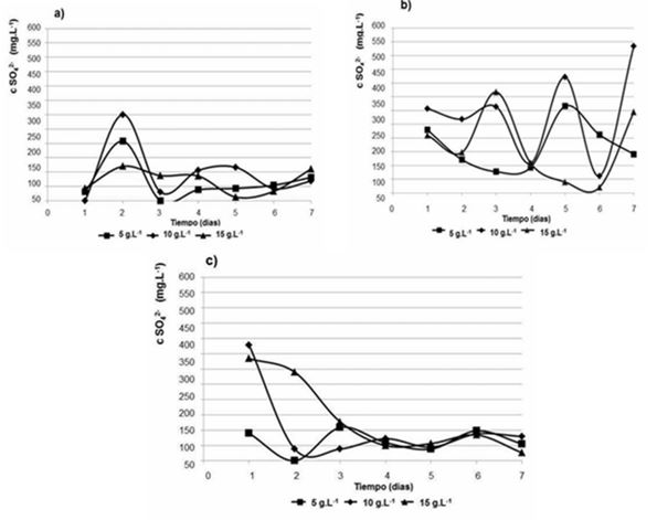 El caso de los experimentos con pH 2 y 4, después del 5to día, continúa aumentando el crecimiento celular. Tales resultados sugieren que los aislados desarrollan una actividad sulfoxidante más efectiva bajo estas circunstancias.7 Así mismo, durante el cultivo, se mostró un aumento de la concentración de sulfato que acompañó al incremento de la densidad celular (Figuras 4 a y b).