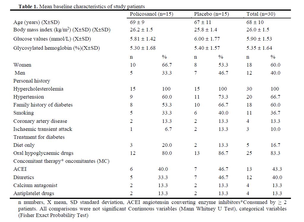 Of 35 enrolled patients, 30 (18 women, 12 men and mean age: 68 years) were randomised to policosanol (n = 15) or placebo (n = 15), while five were not eligible because uncontrolled diabetes values, since patients showed above mentioned exclusion criteria for glycosylated haemoglobin value.