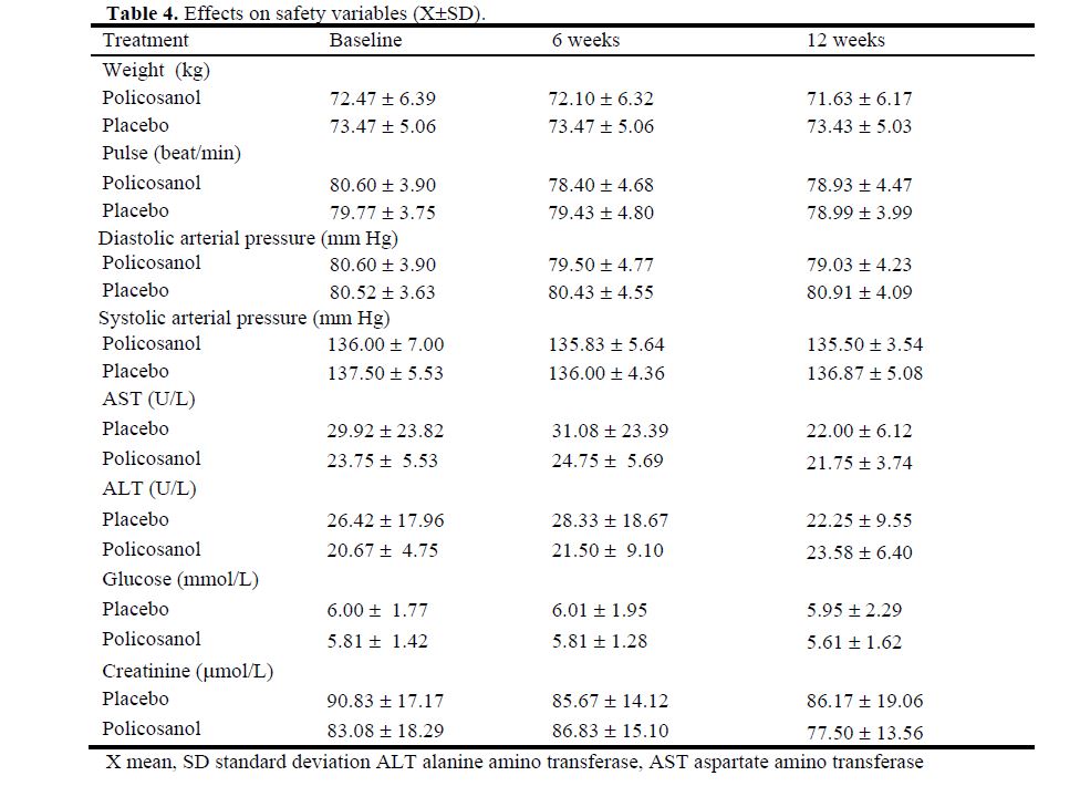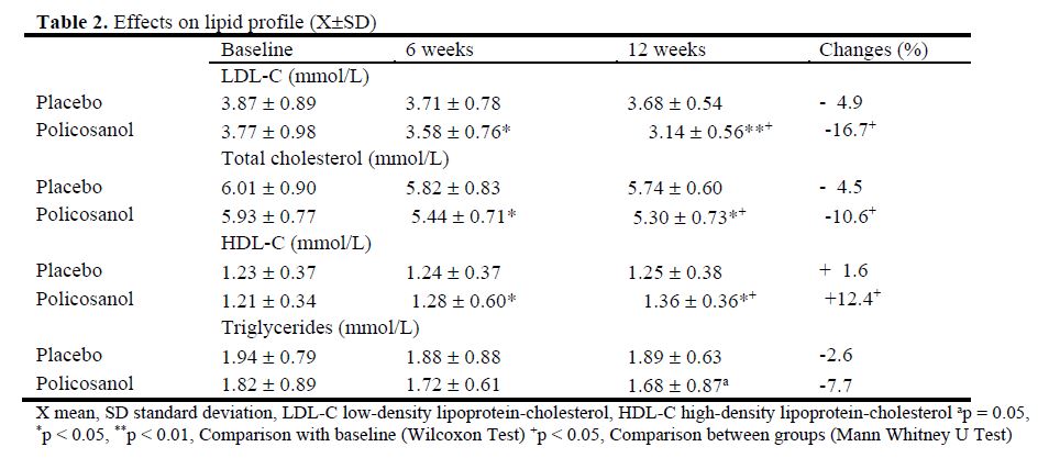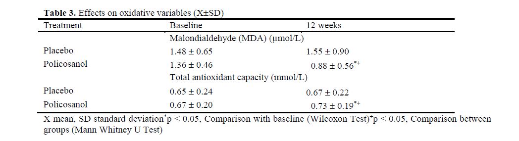 Table 3 shows the effects on plasma oxidative variables. After 12 weeks of treatment with policosanol, all oxidative variables were favorably modified, since it reduced significantly (p<0.05) plasma MDA (vs baseline and vs placebo), while increased (p<0.05) plasma total antioxidant capacity.