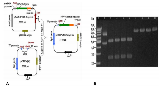 A: Estrategia de sub-clonaje del gen l1 de VPH16 en el plasmidio pET28a(+). B: Electroforesis en gel de agarosa al 0, 8 % de los plasmidios pETHPV16L1myc-His analizados mediante restricción. Carril 1, marcador de peso 1 kb DNa Step Ladder (Promega). Carril 2, plasmidio del clon1 sin digerir. Carriles 2 al 6, plasmidios de los clones 1 al 4 digerido con las enzimas NcoI y XhoI. Carriles 7 al 10 plasmidios de los clones 1 al 4 digerido con la enzima XbaI.