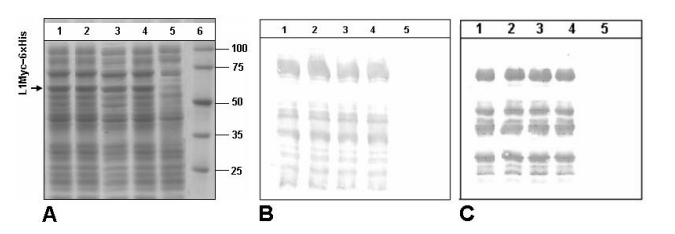 Análisis de la producción de la proteína L1Myc-His. Carriles 1 al 4, 5 μL de extractos celulares de E. coli Shuffle C3026/pETHPV16L1myc-His. Carril 5, 5 μL de extractos celulares de E. coli Shuffle C3026/pET28a (+). Carril 6, 3 μL del marcador de peso Broad Range Molecular Weight Markers (Promega) en kDa. A: análisis mediante SDS-PAGE al 10 % de acrilamida. B y C: Análisis mediante western blot con los anticuerpos monoclonales anti-L1 (MAB 885) 1: 50 000 y anti-Myc (CB9E10) 1: 2 000. De los resultados obtenidos se puede concluir que es posible expresar al gen l1 silvestre del virus del papiloma humano tipo 16 procedente de un aislado clínico cubano a niveles detectables en SDS-PAGE y western blot, lo cual constituye un reporte preliminar que brinda la posibilidad de contemplar a Escherichia coli Shuffle C3026 (DE3) como un posible hospedero para la producción de altos niveles de la proteína L1myc-6xHis en vista a la elaboración de un candidato vacunal.