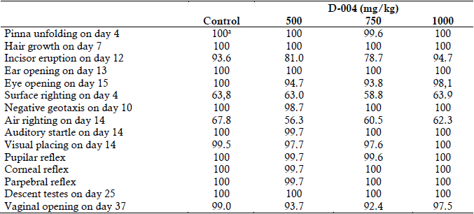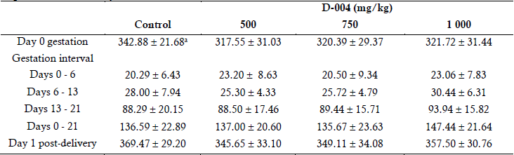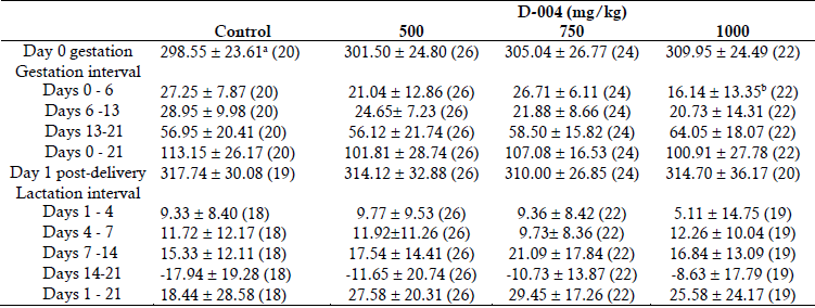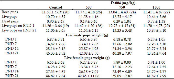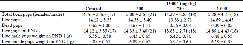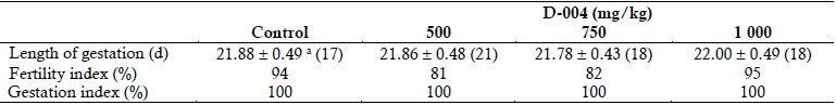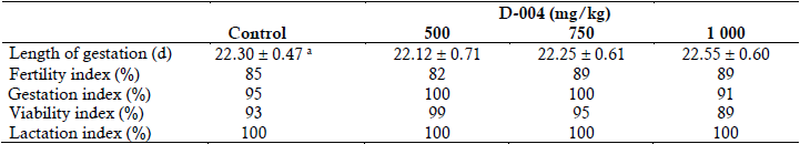 No evidence of toxicity was observed during treatment. Mean body weights of mothers of parental generation in the treatment groups were not significantly different from the control group during gestation and lactation periods, but body weight gain in the group treated with D-004 1000 mg/kg/d was significantly less than control in the period between 0 to 6 days of gestation (Table 1). Treatment did not appear to affect food consumption (data not shown). One female in the 1 000 mg/kg group died due to gavage error. No apparent treatment- related signs of reproduction toxicity were associated with D-004 exposure. The length of gestation was unchanged by treatment, like fertility, gestation, viability and lactation indexes (Table 2).